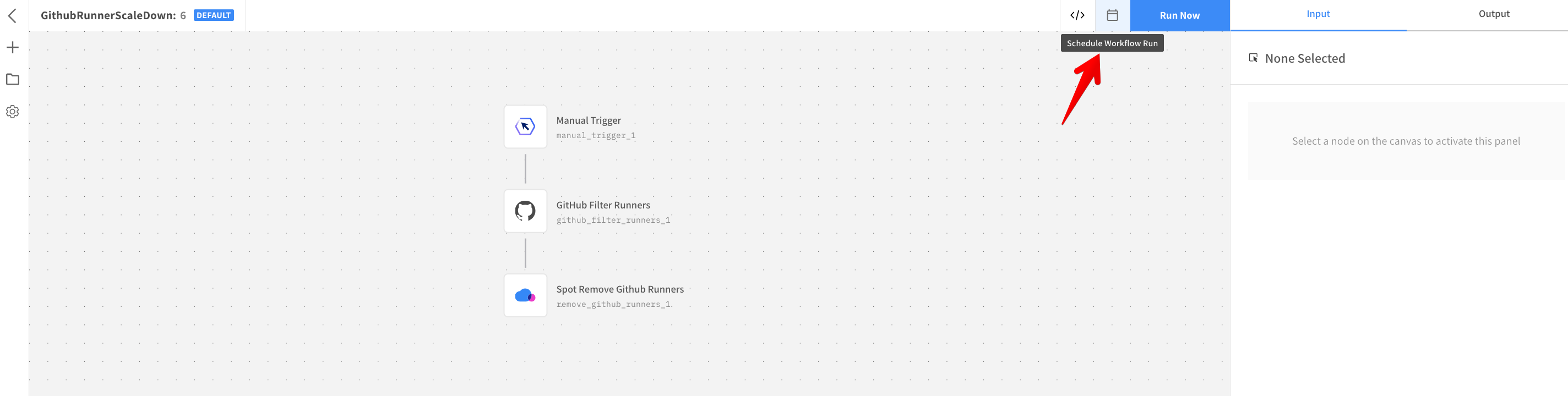 Click the calendar icon to schedule the scale-down flow. You can schedule the scale down flow to run at a fixed interval of time (for example: every 15 minutes) or you can use a Cron expression.